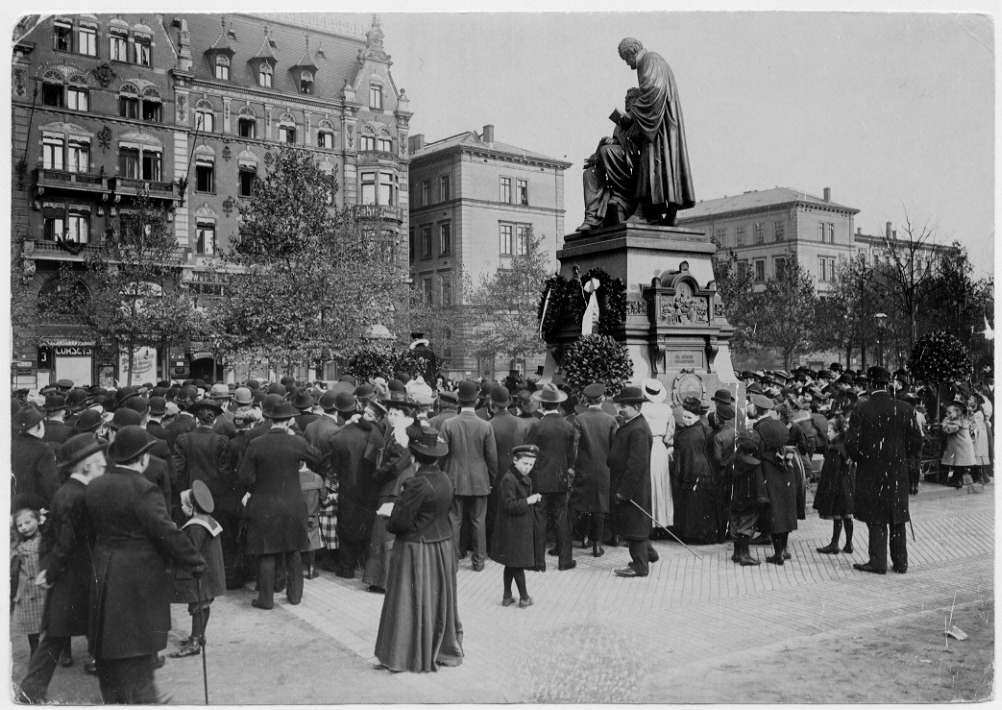 | Die Einweihung erfolgte mit großer Feierlichkeit am 10.11.1883, dem 400. Geburtstag Luthers. Das Denkmal zeigt Martin Luther, den älteren von beiden, auf einem Sessel sitzend, seinen Freund und Helfer Philipp Melanchthon neben ihm stehend, zu ihm herabgebeugt. Luther hält eine aufgeschlagene Bibel auf den Knien und blickt sinnend in die Ferne. An den vier Seiten des Sockels, der aus rotem Granit besteht, sind Reliefs und Inschriften angebracht. An der Westseite "Einführung der Reformation in Leipzig", Nordseite "Die Ausspendung des Abendmahls unter beiderlei Gestalt", Südseite "Kirchengesang, Taufe, Konfirmation" und Ostseite "Hausandacht, Predigt, Trauung". Das Eisenwerk Lauchhammer führte den Bronzeguß aus, den Sockel der Leipziger Steinhauermeister F.G. Damm. |